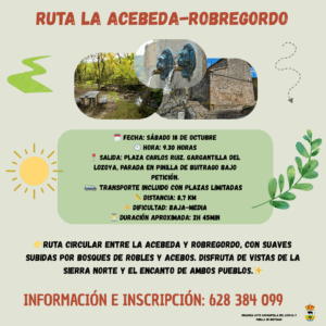 🥾 Ruta Circular La Acebeda – Robregordo 📅 Fecha: 18 de octubre🕤 Salida: 9:30 desde Gargantilla del Lozoya🚏 Parada opcional para recoger vecinos: Pinilla de