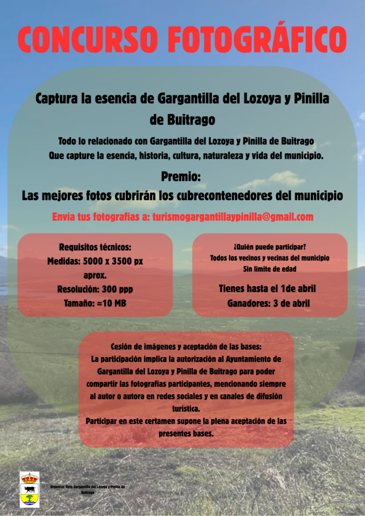 La participación implica la autorización al Ayuntamiento de Gargantilla del Lozoya y Pinilla de Buitrago para poder compartir las fotografías participantes, mencionando siempre al autor o autora en redes sociales y en canales de difusión turística.